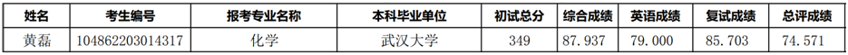 同时,根据化学专业复试总评成绩排序,依次递补拟录取化学专业考生户雪晴。