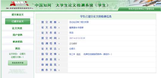 7、对于论文初检不合格的学生,再次对修改后的毕业论文检测前,需要向院系管理员申请权限,当院系管理员重新分配权限后,复检学生再次登录该系统,登录后会显示如下页面。在“提交权限”一栏会显示“请重新提交”字样,这表明院系管理员已经给予权限,可再次提交论文。同时,在该页面可以看到论文状态、指导教师对第一次提交论文的修改意见和审阅意见。