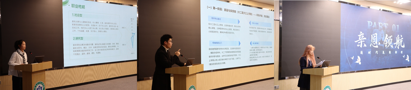 在主持人对赛道设置和展示流程进行了简要介绍之后,宣布比赛正式开始。成长赛道的展示环节首先进行,桑恩惠、崔淼、何芊凝三位选手依次从科研探索、专业学习、兴趣培养到未来方向展示了多维度的成长规划。评委结合行业发展趋势与个人实际情况,从阶段目标设定、行动方案可行性、关键能力提升等方面给予专业点评。例如,有评委提出应更重视从具体实际案例的剖析中发掘个人潜力,也有建议加强对相关行业的长期调研和岗位匹配分析。