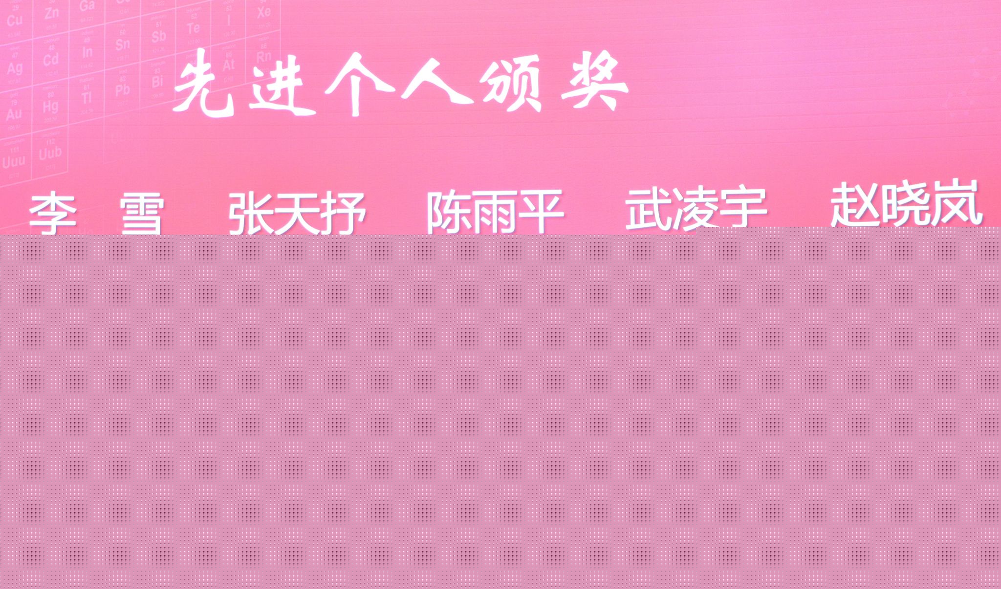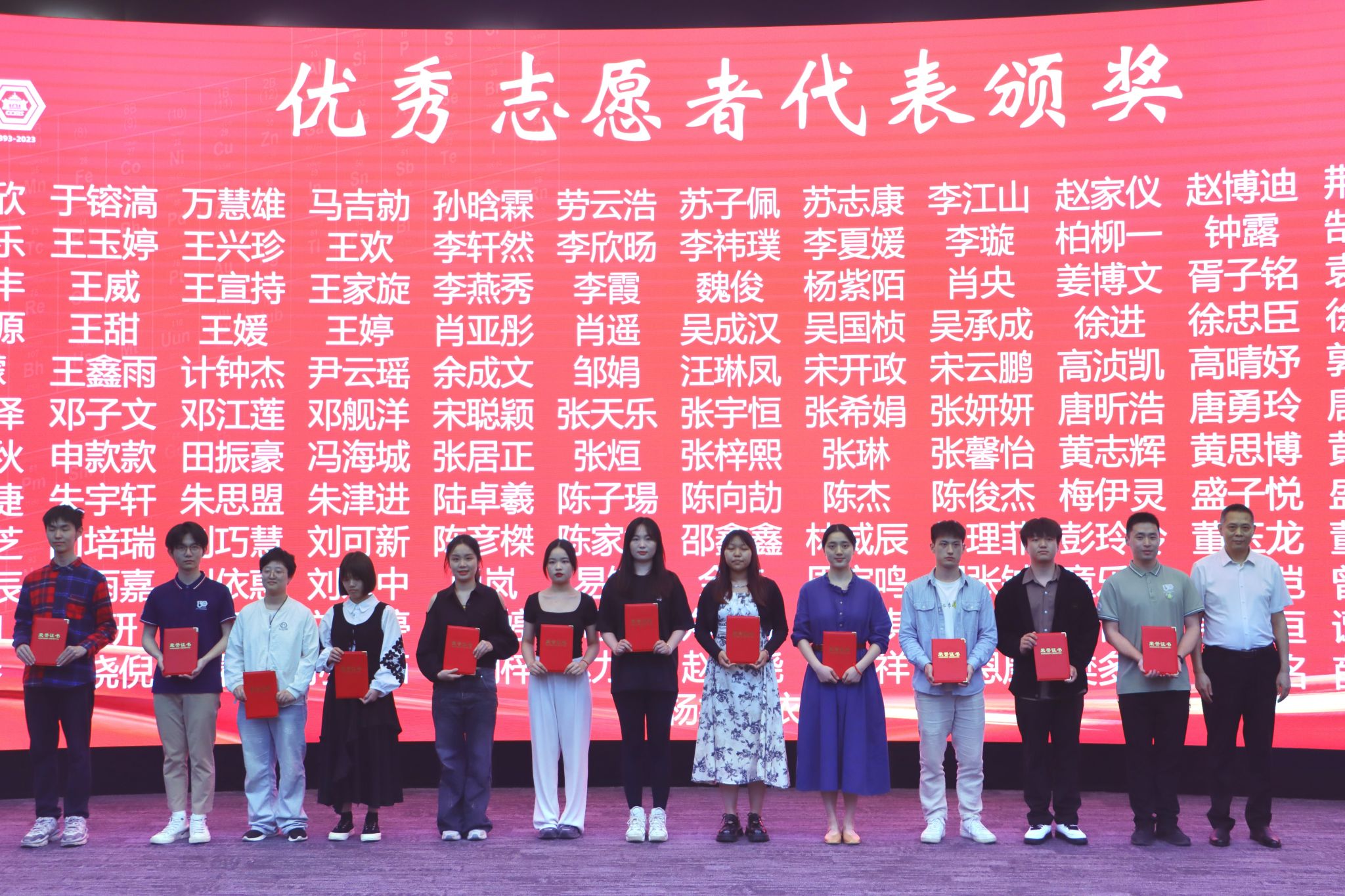 党委副书记王中全宣读了《关于表彰武大化学130周年庆祝工作突出贡献集体和先进集体、突出贡献个人和先进个人的决定》。分析科学中心等三个单位获评“突出贡献集体”;高分子科学系等两个单位获评“先进集体”;王允等11人获评“突出贡献个人”;丁琼等26人获评“先进个人”;丁贵冯等181人获评“优秀志愿者”。